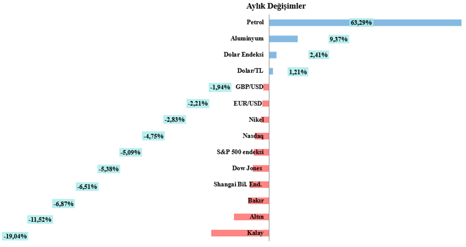 Petrol fiyatlarındaki yükselişin enflasyon beklentilerini artırması ve Fed’in şahin duruşunu koruması da bakır fiyatları üzerinde ilave baskı yarattı. Ayın sonuna doğru, 23 Mart tarihinde bakır fiyatları 19 Aralık’tan bu yana en düşük seviye olan 11.700 dolar/ton seviyesine kadar geriledi. Ancak bu seviyeden gelen alımlar ve yatırımcıların Orta Doğu’daki gerilimin azalabileceğine yönelik beklentilerinin artmasıyla fiyatlar sınırlı da olsa destek buldu. Buna rağmen kayıplar telafi edilemedi ve bakır, Mart ayını %6,87 düşüşle 12.382,5 dolar/ton seviyesinden tamamladı.
